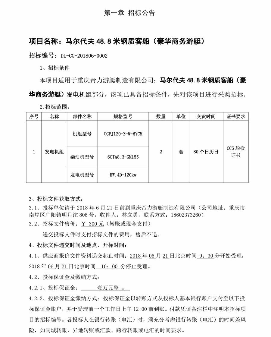 馬爾代夫48.8米鋼質客船(豪華商務游艇)發電機組部分采購招標
