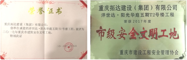 2018年3月16日,經重慶市建設工程安全管理協會嚴格甄選,洋世達·南濱特區(陽光華庭五期)二區T2號樓項目榮獲“2017年度市級安全文明工地”的稱號。