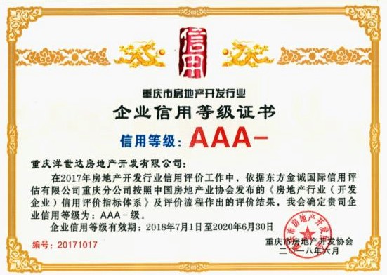 2018年6月,經(jīng)東方金誠國際信用評估有限公司重慶分公司的嚴(yán)格甄選,重慶洋世達房地產(chǎn)開發(fā)有限公司榮獲了重慶市房地產(chǎn)開發(fā)協(xié)會頒發(fā)的2018年7月至2020年6月的AAA-級信用等級證書。