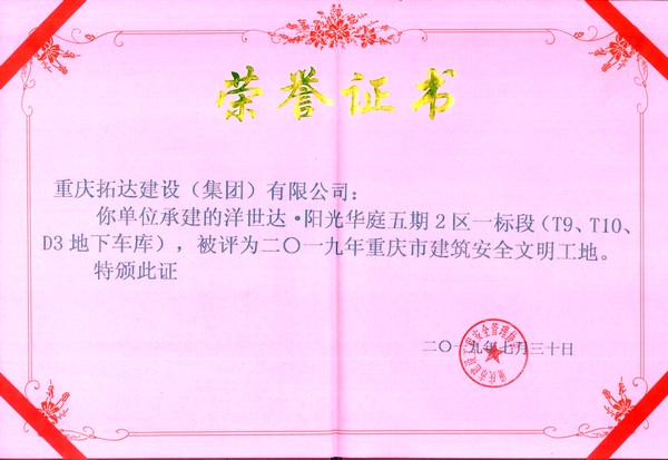 2019年7月,經(jīng)重慶市建設(shè)工程安全管理協(xié)會嚴(yán)格甄選,洋世達(dá)?陽光華庭五期2區(qū)標(biāo)段(T9、T10、D3地下車庫)項(xiàng)目榮獲“2019年度建筑安全文明工地”的稱號。